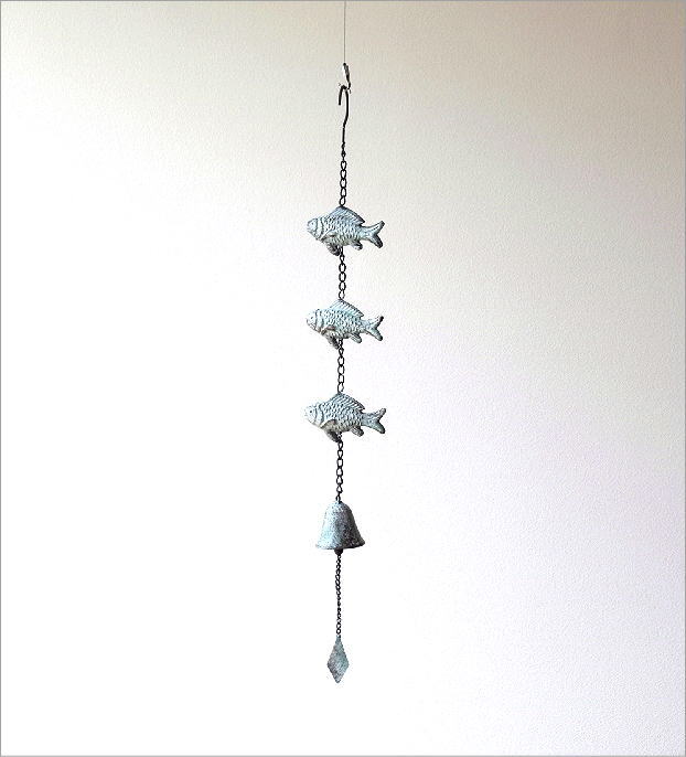 アイアンベル ベランダや玄関先に吊り下げて オブジェとして楽しめる アイアン製のベルです 風鈴のように 風には なびきませんが 揺らすと 澄んだ音色が響きます 小さなフィッシュが3匹 お行儀よく並んだベルです かすれたようなレトロペイントで 辺りの景色に馴染みます 商品詳細 商品名 アイアンフィッシュベル 商品番号 mty3036 全体のサイズ (cm) 幅12×奥行7×高さ86 材質 アイアン 重量 500g 生産国 中国 ※サイズ・重量はおおよその値です 一つずつ手作業での生産につき多少の違いはご了承ください - 備考 - アイアンに多少のアバウトさがある商品です 経年により、直射日光や風雨によるダメージは避けられません。